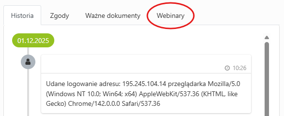 - Linki do nagranych spotkań znajdują się w zakładce Webinary, w prawej części ekranu